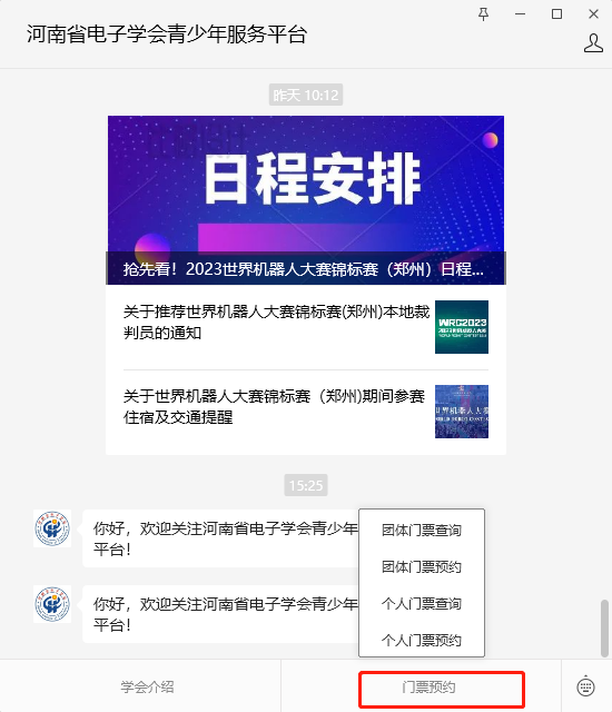 1、本次比赛的观赛门票不收取费用,线上预约平台为“河南省电子学会青少年服务平台”公众号,提醒须先关注公众号后才能审核通过。
