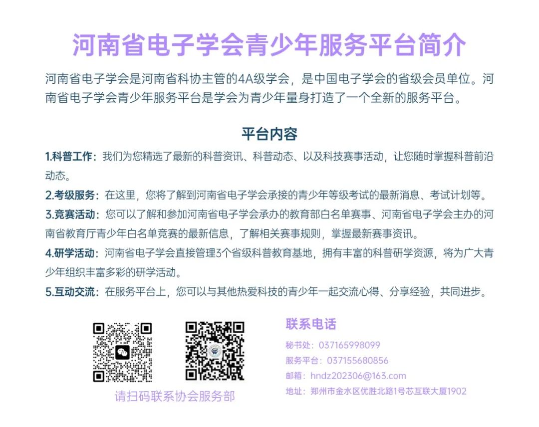 识别二维码关注公众号“河南省电子学会青少年服务平台”
