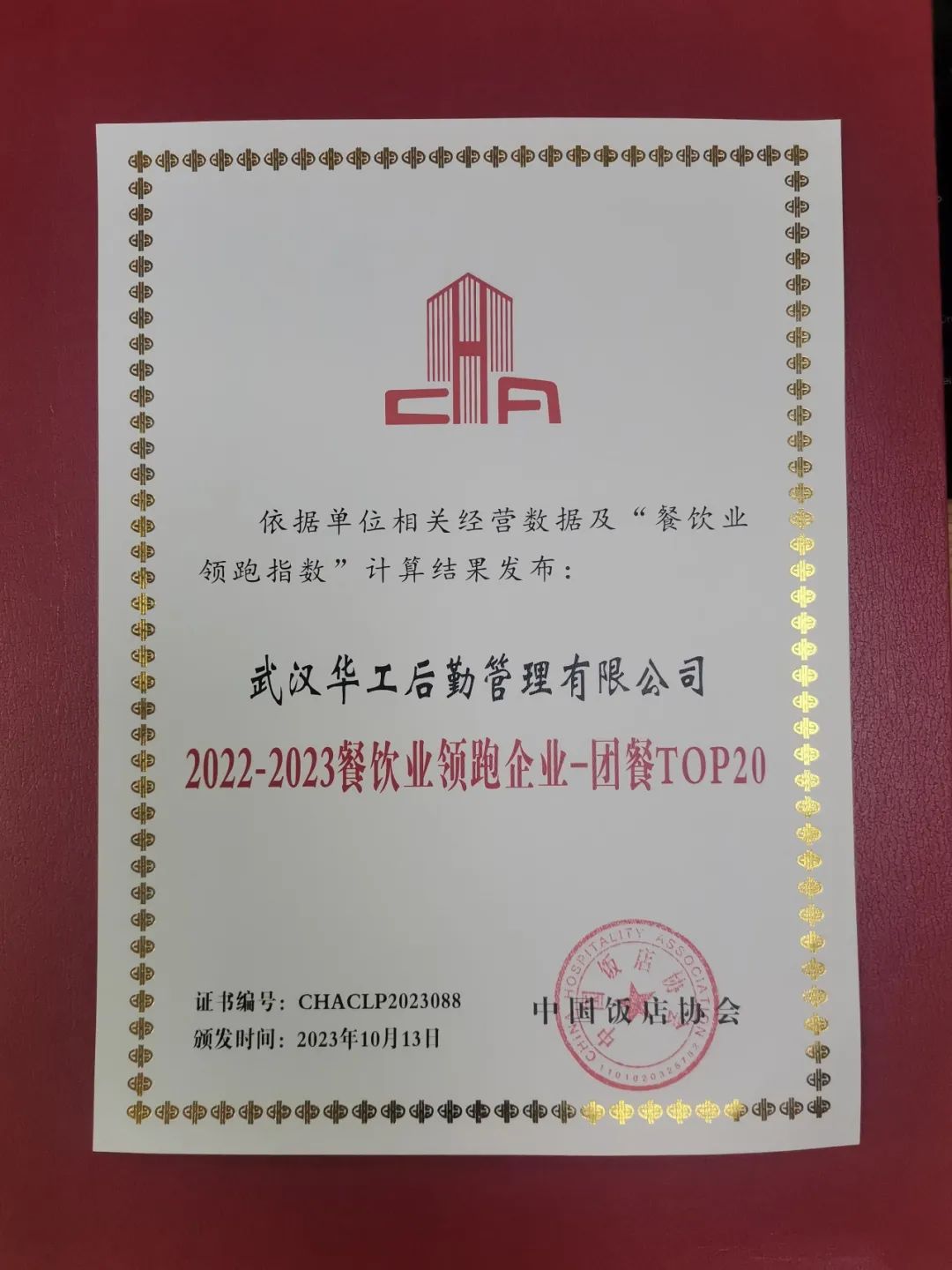 2023年10月13日--15日,由中国饭店协会主办的第二十四届中国美食节暨首届中国海洋美食文化节在青岛举行。武汉华工后勤管理有限公司以团餐行业TOP前20入选2022--2023全国餐饮业领跑企业。