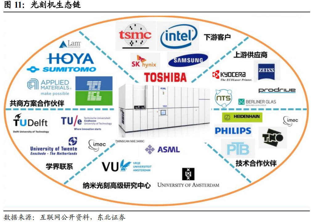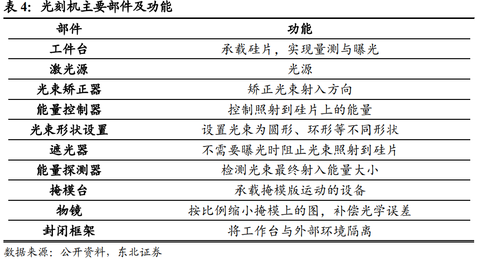全世界没有任何一家公司可以独立制造光刻机,其生产技术要求极高,可以分为十一个主要部件,包含超过十万个零件,涉及上下游多家供应商,具有极强的生态属性。光刻机的主要部件有工件台、激光源、光束矫正器、能量控制器、光束形状设置、遮光器、能量探测器、掩模台、物镜、封闭框架与减震器。