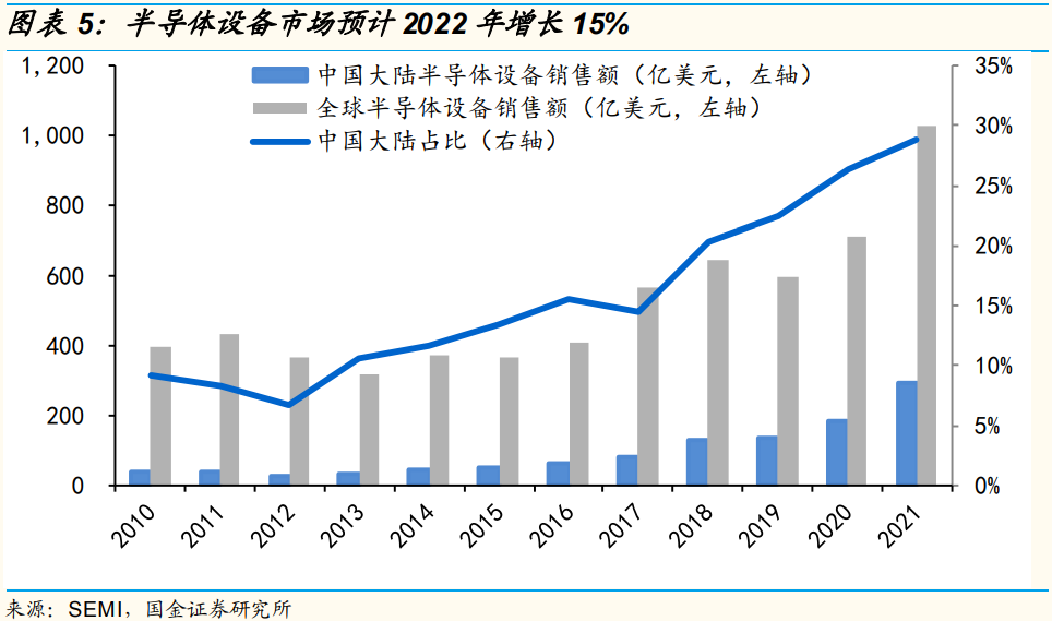 半导体设备市场2022年增长15%。根据SEMI统计,全球半导体设备销售规模从2010年395亿美元增长到2021年的1026亿美元,其中中国大陆市场296亿美元。SEMI预计到2022年将进一步增长15%至1175亿美元。