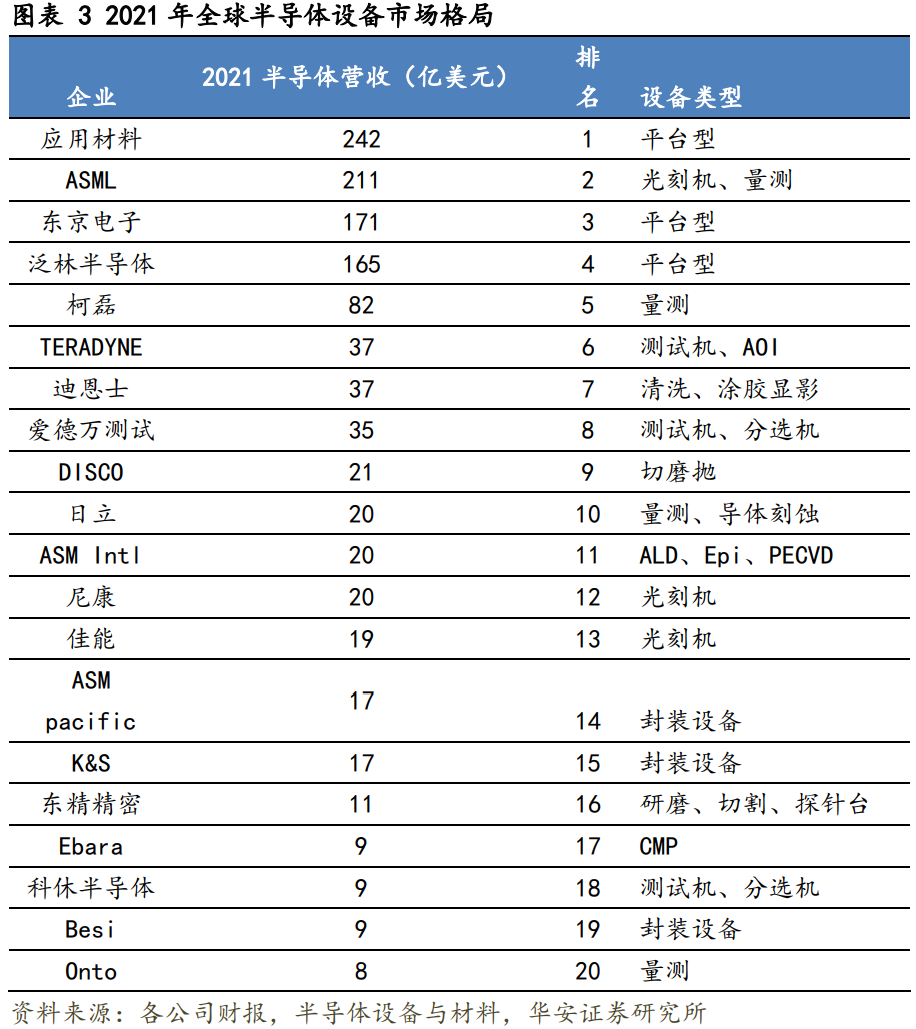 以产业链应用环节来划分,半导体设备可分为前道工艺设备(晶圆制造)和后道工艺设备(封装测试)两个大类。其中后道工艺设备还可以细分为封装设备和测试设备。设备中的前道设备占据了整个市场的80%-85%,其中光刻机,刻蚀机和薄膜设备是价值量最大的三大环节,各自所占的市场规模均达到了前道设备总量的20%以上。因此,全球半导体设备前十名厂商之中,有多家是平台型企业,横跨多个半导体工艺环节。