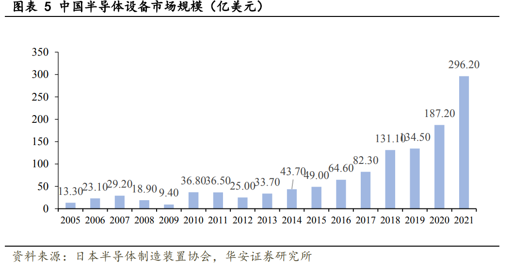 半导体设备行业波动性成长,产业链最下游电子应用终端发生新变化,产生新需求。半导体设备行业呈现波动性上涨的趋势。近二十年间半导体设备的周期性正在减弱,行业成长趋势加强。得益于各类电子终端的芯片需求,智能化,网联化,AIOT的发展,行业规模连续四年出现大幅度的正增长。2022年仍将维持较高增速,这在半导体设备发展历史上极为罕见。
