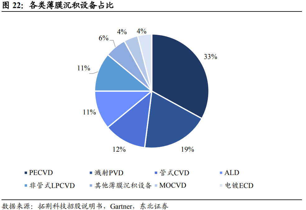 近年来,下游产业新技术、新产品快速发展,正迎来市场快速增长期。5G手机、新能源汽车、工业电子等包含的半导体产品数量较传统产品大比例提高;人工智能、可穿戴设备和物联网等新业态的出现,对于半导体产品产生了新需求。经过不断发展,根据不同的应用演化出了PECVD、LPCVD、溅射PVD、ALD等不同的设备用于晶圆制造的不同工艺。其中,PECVD是薄膜设备中占比最高的设备类型,占整体薄膜沉积设备市场的33%;ALD设备目前占据薄膜沉积设备市场的11%;SACVD是新兴的设备类型,属于其他薄膜沉积设备类目下的产品,占比较小。