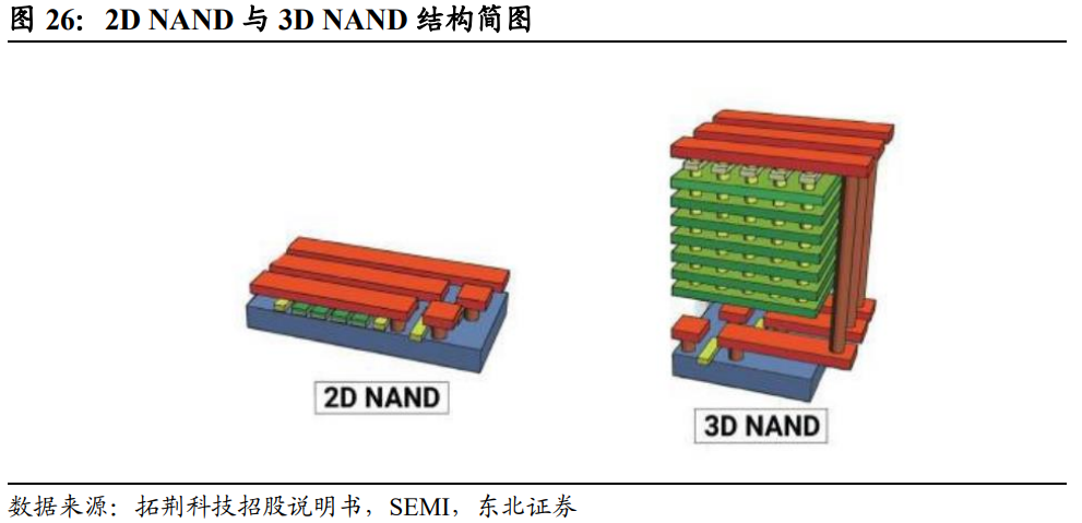 随着当前存储器性能瓶颈的出现,主流工艺方式不断拓展,精密结构加工所需的设备性能要求不断增加。在FLASH存储芯片领域,随着主流制造工艺由2DNAND发展为3DNAND结构,相关产线中薄膜设备支出占比由18%提升至26%,结构的复杂化导致对于薄膜沉积设备的需求量也逐步增加。