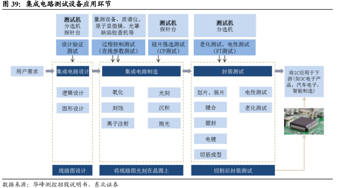 晶圆与芯片两大检测领域,三大设备协同作用。集成电路生产需要检测工艺是否合格、版图设计是否合理、产品是否可靠,而这些都需要用到专门的测试设备,以此提高芯片制造水平,保证芯片质量。测试设备主要有测试机、分选机和探针台三大类设备,其中测试机用于检测芯片功能和性能,对芯片施加输入信号,采集输出信号来判断芯片在不同工作条件下功能和性能的有效性;而分选机和探针台则是将芯片的引脚与测试机的功能模块起来,进而实现批量自动化测试。在晶圆检测中,探针台将晶圆传送至测试位置,芯片的Pad点通过探针、专用连接线与测试机连接,测试机通过I/O信号,判断芯片性能是够是否达到规范设计要求。在芯片检测中,分选机将被测芯片逐个自动传送至测试工位,测试机对芯片进行性能检测,最后分选机将被测芯片进行标记、分选、收料。