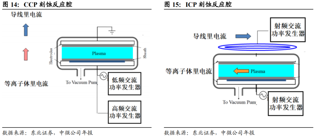 作为半导体制造过程中三大核心工艺之一,刻蚀可以简单理解为用化学或物理化学方法有选择地在硅片表面去除不需要的材料的过程,可以分为干法刻蚀和湿法刻蚀,目前市场主流的刻蚀方法均为干法刻蚀,可将其分为CCP刻蚀和ICP刻蚀。CCP刻蚀主要是以高能离子在较硬的介质材料上,刻蚀高深宽比的深孔、沟槽等微观结构;而ICP刻蚀主要是以较低的离子能量和极均匀的离子浓度刻蚀较软的或较薄的材料。