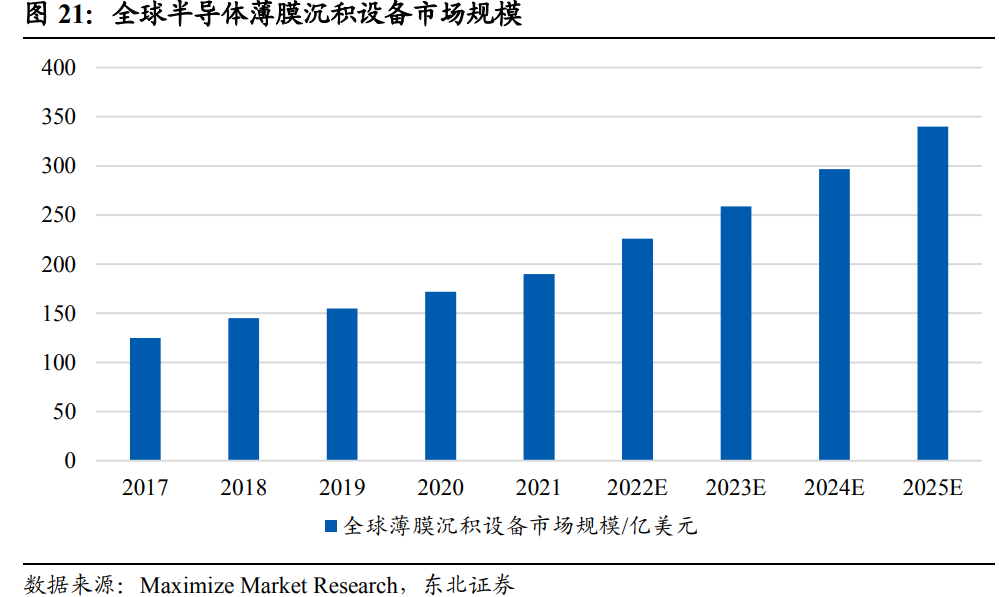 随着半导体行业整体景气度的提升,全球半导体设备市场呈现快速增长态势,拉动市场对薄膜沉积设备需求的增加。根据Maximize Market Research数据统计,2017-2020年全球半导体薄膜沉积设备市场规模分别为125亿美元、145亿美元、155亿美元和172亿美元,2021年扩大至约190亿美元,年复合增长率为11.04%。预计全球半导体薄膜沉积设备市场规模在2025年将从2021年的190亿美元扩大至340亿美元,保持年复合15.7%的增长速度。