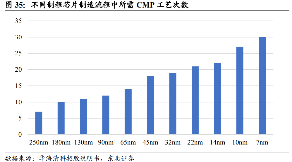 芯片复杂化,CMP步骤次数提升。随着芯片制造技术发展,CMP工艺在集成电路生产流程中的应用次数逐步增加,以逻辑芯片为例,65nm制程芯片需经历约14道CMP步骤,而7nm制程所需的CMP处理增加为30道;晶体管结构从平面型向3DFinFET转变,新增10次CMP过程;存储器由2D向3D转换,新增5次CMP步骤。