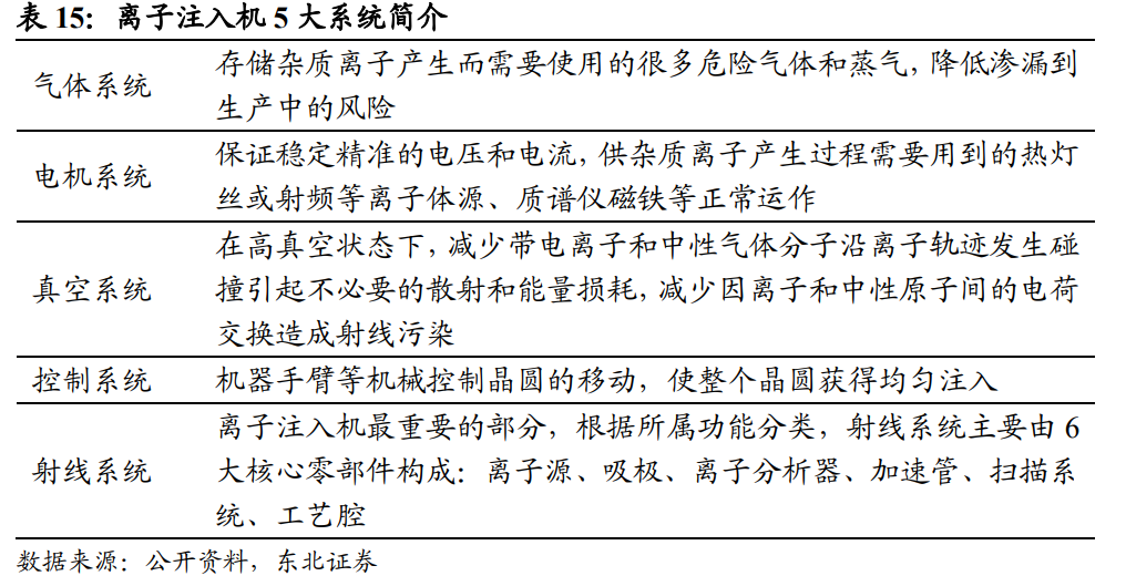 离子注入机约占半导体前道设备的2~3%,大束流离子注入机占比过半。从半导体前道设备规模来看,离子注入机约占2~3%,对应2021年全球市场规模约22亿美元,国内市场规模6亿美元。在三类主要离子注入机中,大束流离子注入机占比约60%,中束流离子注入机占比约20%,高能离子注入机占比约18%,可分别推算出2021年国内市场中三类离子注入机市场规模为3.6/1.2/1.08亿美元。