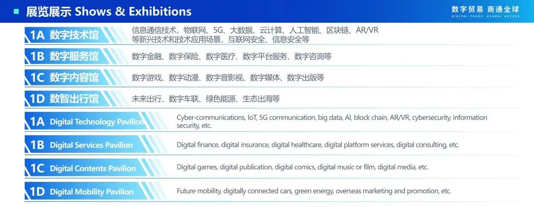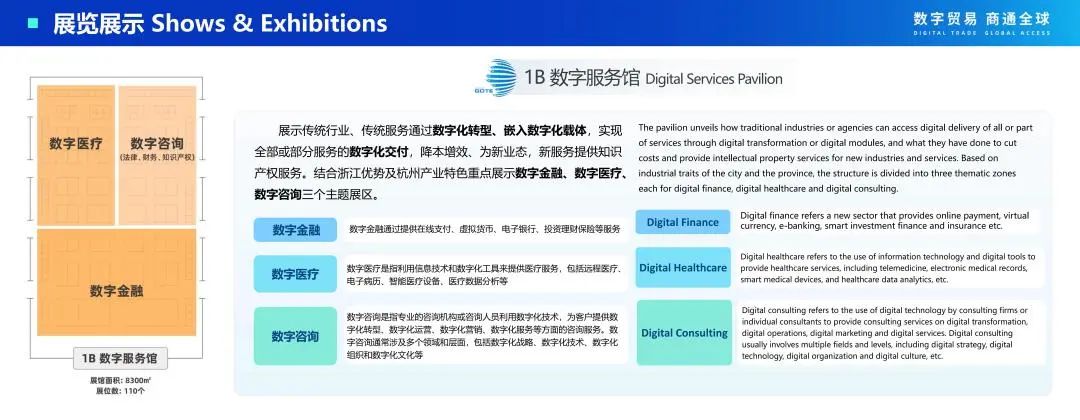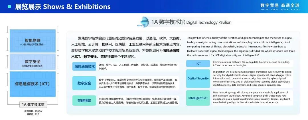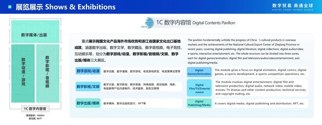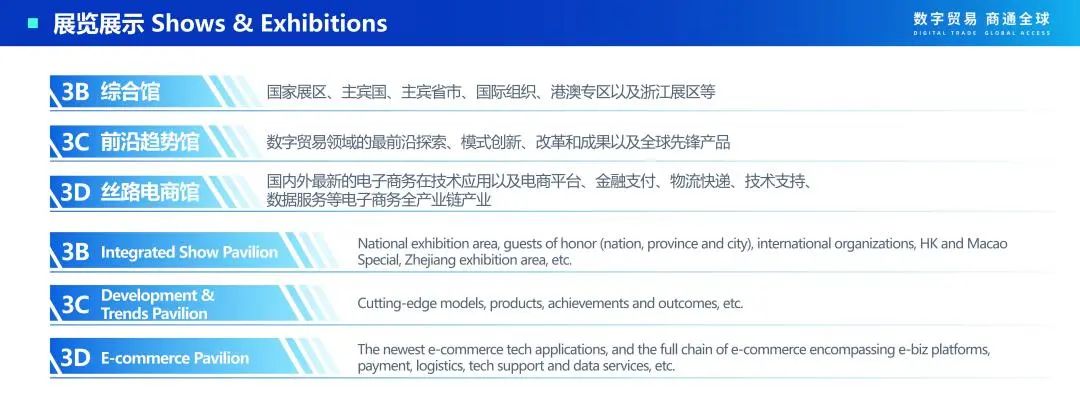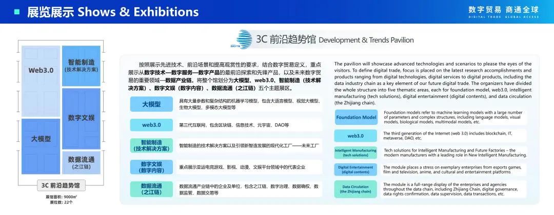按照展示先进技术、 前沿场景和提高观赏性的要求 ,结合数字贸易定义 ,重点 展示从数字技术—数字服务—数字产品的最前沿探索和先锋产品 , 以及未来数字贸 易的重要领域—数据产业链。将整个馆划分为大模型、web3.0、智能制造(技术解 决方案)、数字文娱(数字内容)、数据流通(之江链)五个主题展区。