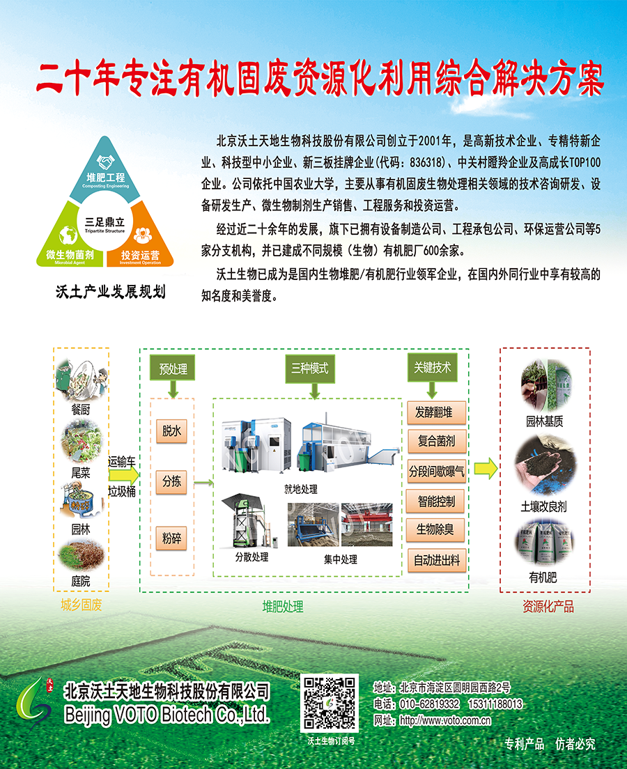 北京沃土天地生物科技股份有限公司成立于2001年,高新技术企业、专精特新企业、全国科技型中小企业、新三板上市企业(836318)、中关村高成长TOP100企业。公司立足于环保产业和生态农业领域,主要从事有机固废生物处理相关领域的技术咨询与研发、设备和微生物制剂生产销售、堆肥工程服务和投资运营。经二十余年发展,沃土生物已成为国内堆肥技术源头,在国内外同行业享有较高的知名度和美誉度,可提供有机固体废弃物资源化利用综合解决方案。