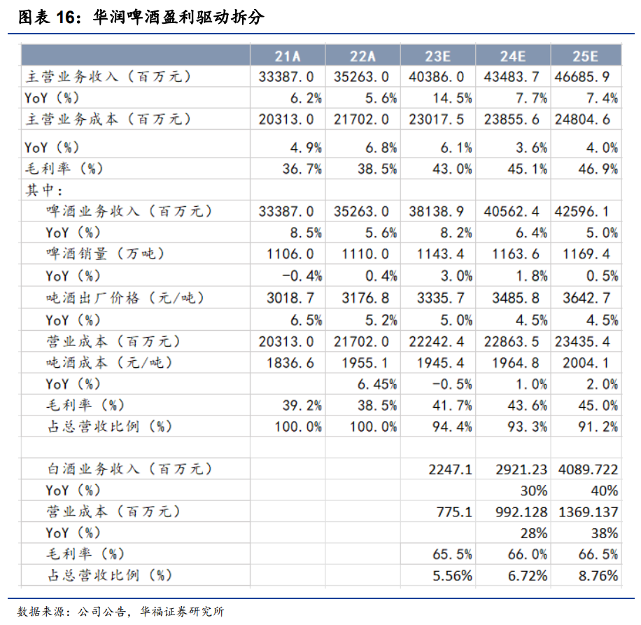3)毛利率:我们预计伴随公司高端化的推进,啤酒业务毛利率将稳步提升,预计23-25年毛利率分别为41.7%/43.6%/45%