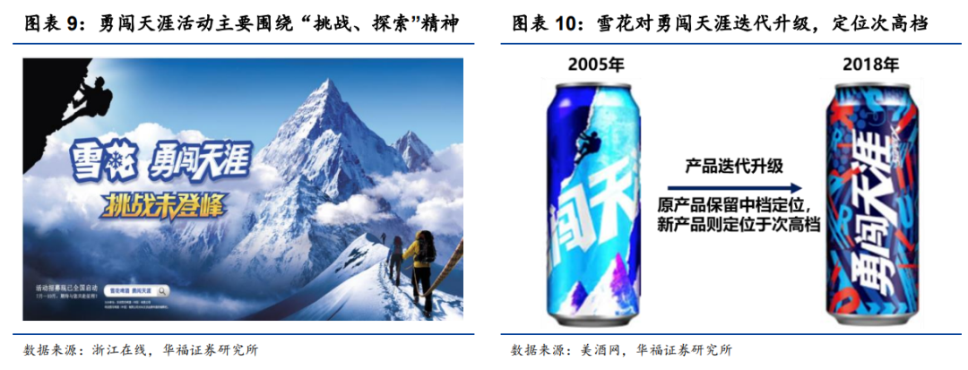 大单品带领本土品牌陆续着陆次高端。过去雪花品牌旗下产品主要以中低端为主,且销售体量庞大,因此其中低端形象深入人心,为此华润啤酒主要通过大单品对品牌形象的重塑来实现“拖拽式”结构升级,如“勇闯天涯”啤酒抓住年轻人的情感价值,连续举办同名活动宣传其品牌理念,与年轻人形成精神共鸣,成功成为全国第一大单品,并将雪花品牌拖拽至中档定位,而在后期产品成熟后再进一步推出SuperX定位次高端,实现老树新树共开花的结果。另外,公司还积极推出定位高端以上档次的纯生产品,借力当前已发展成熟的“纯生”品类赋能雪花品牌的高端升级。