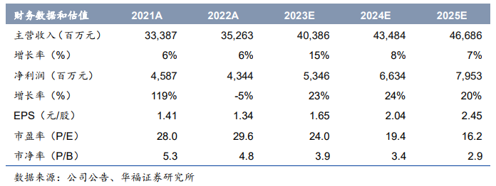 费率方面,我们预计白酒业务的加入会在一定程度上增加公司的销售费用率以及管理费用率,但伴随业务未来步入成熟阶段后预计将有所改善,预计23-25年销售费用率分别为20.3%/20.3%/20.2%,管理费用率分别为10.2%/10.2%/10.1%。我们预计公司23-25年主营业务收入分别为403.86/434.84/466.86亿元,同比增速分别为14.5%/7.7%/7.4%;归母净利润分别为53.46/66.34/79.53亿亿元,对应 PE分别为24/19/16倍。