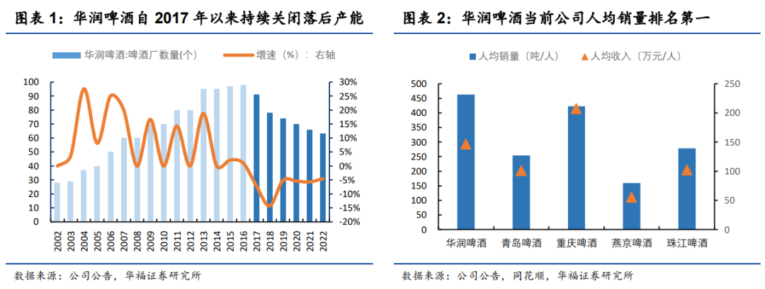 公司占据我国最大的啤酒市场份额。17-22年,公司持续关闭落后产能改善运营效率,当前人均销量、人均创收均位于行业前列,精益运营为后续高端化发展提供了良好支撑。