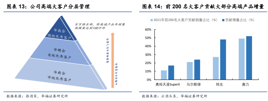 大客户平台搭建,聚势而强拥抱高端。过去公司渠道模式主要以深度分销为主,对应经销商数量多、体量小,难以渗透AB类餐饮、夜场等高端酒主要销售渠道。为使高端产品的发展潜力最大化,公司2021年推出铸剑行动持续招募高端大客户,将大客户按照高端酒销售规模大小进行分层管理。2021年,公司前20%的大客户贡献了华润雪花中国区销量近60%,夜场专业客户贡献了近50%的夜场销量。