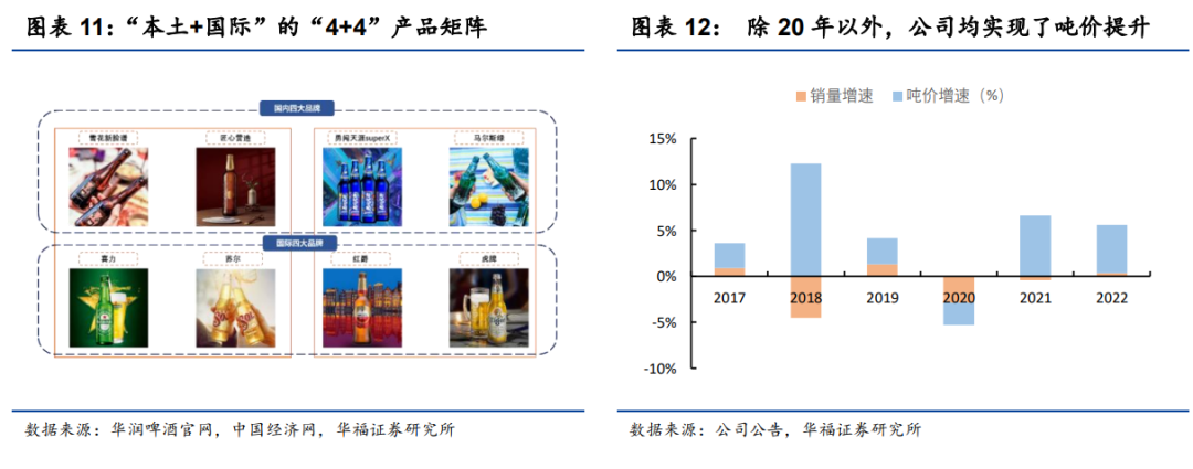 国际品牌赋能高端市场大举突破。公司在2018年收购喜力中国,并于2019年推出“4+4”产品矩阵,即“本土+国际”双品牌策略,产品上实现了所有档次全覆盖。国际品牌的加入不仅为公司进攻高端市场提供了有力抓手,还大幅增强了公司在市场运作方面的可操作性,2019-2022年以来,除2020年受疫情影响外,其余年份均实现了正向增长。