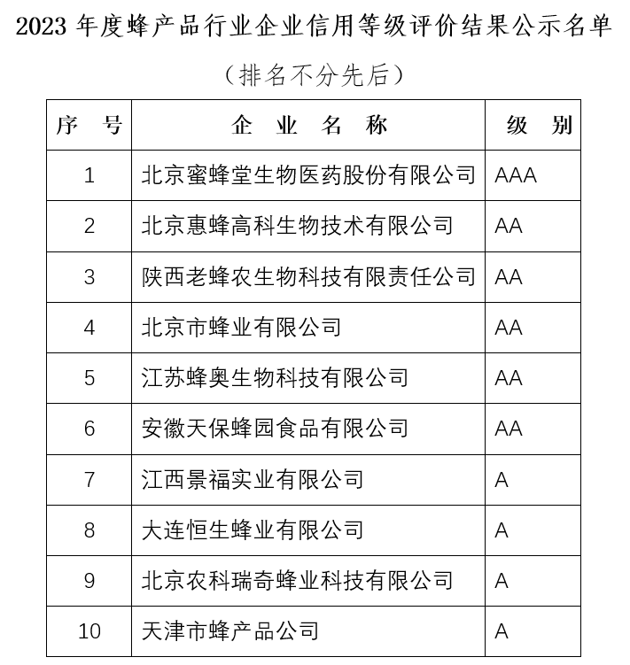 为了推动行业信用体系建设,提高行业信用水平和企业信用风险防范能力,中国蜂产品协会在2023年8月至9月开展了2023年度蜂产品行业信用评价工作。