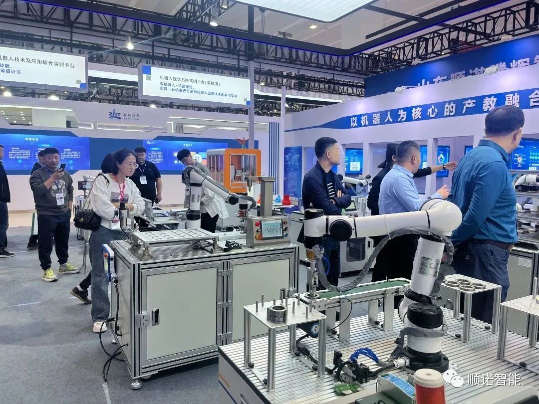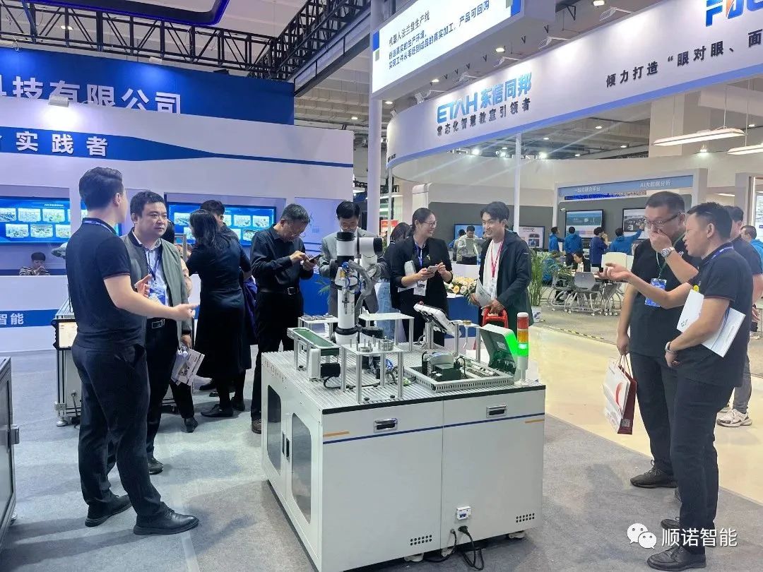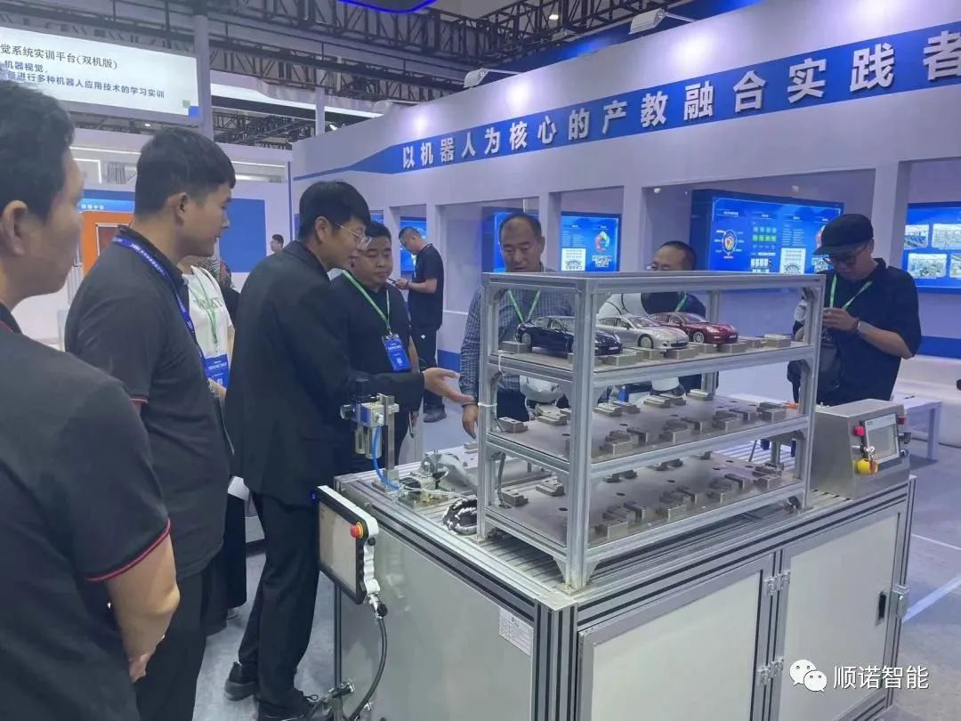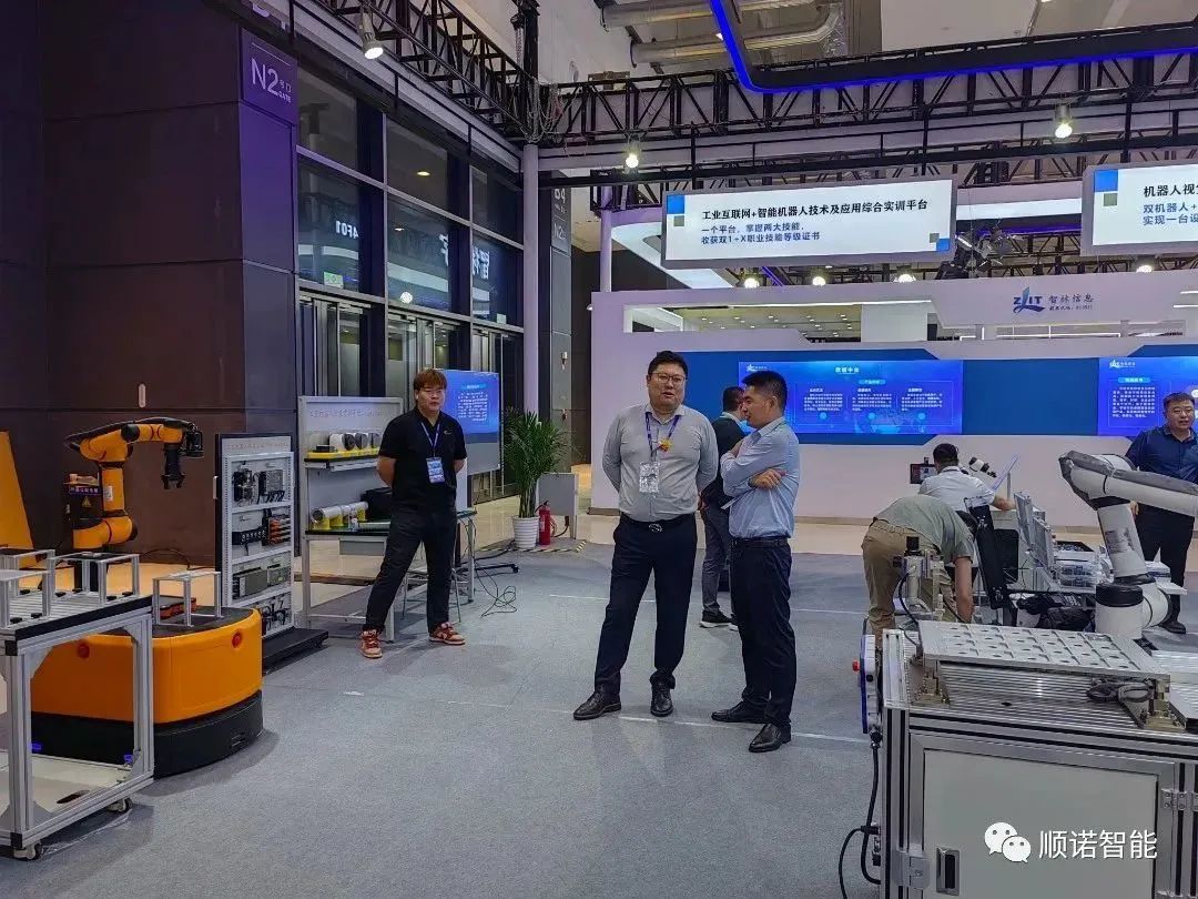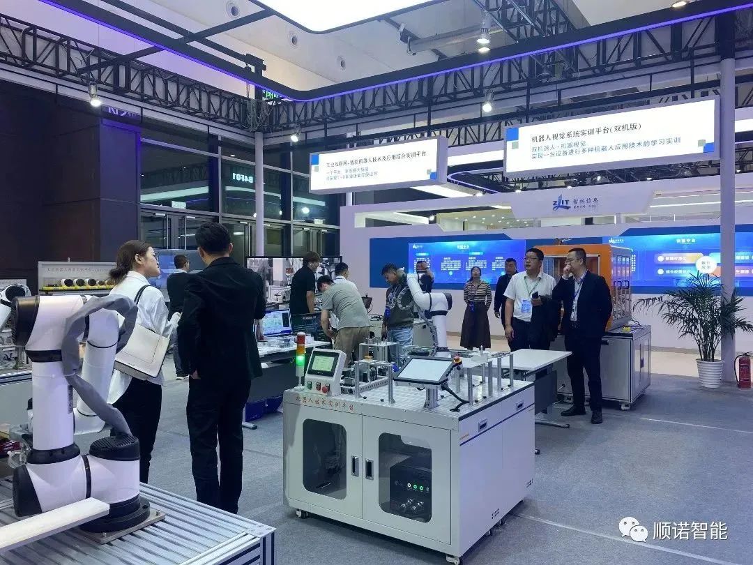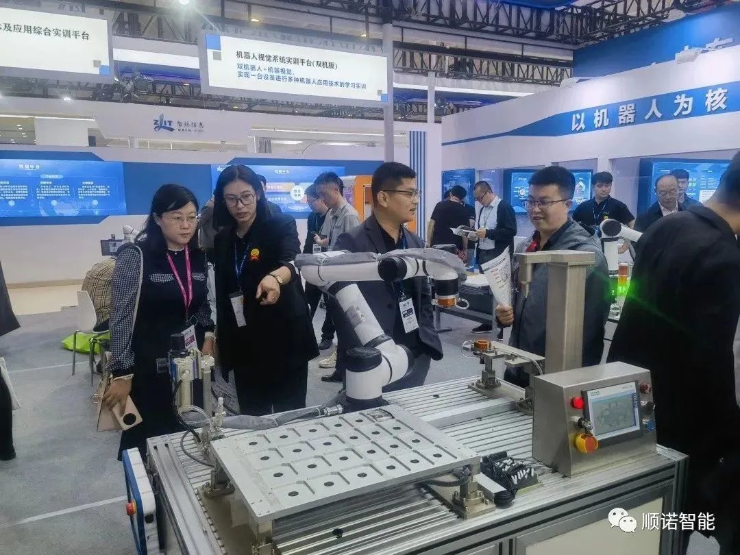 作为以机器人为核心的产教融合实践者,顺诺智能携新能源汽车智能制造实训生产线系列产品和双1+X证书|工业互联网+智能机器人技术及应用综合实训平台亮相本届高博会。