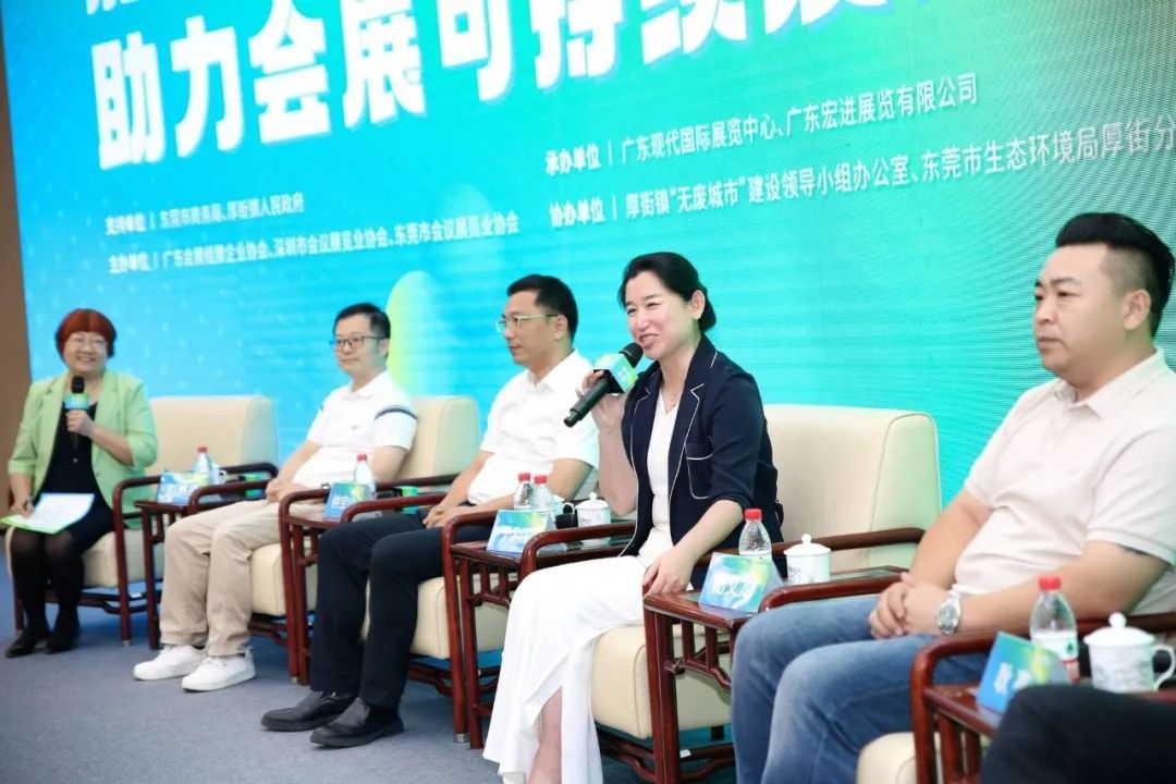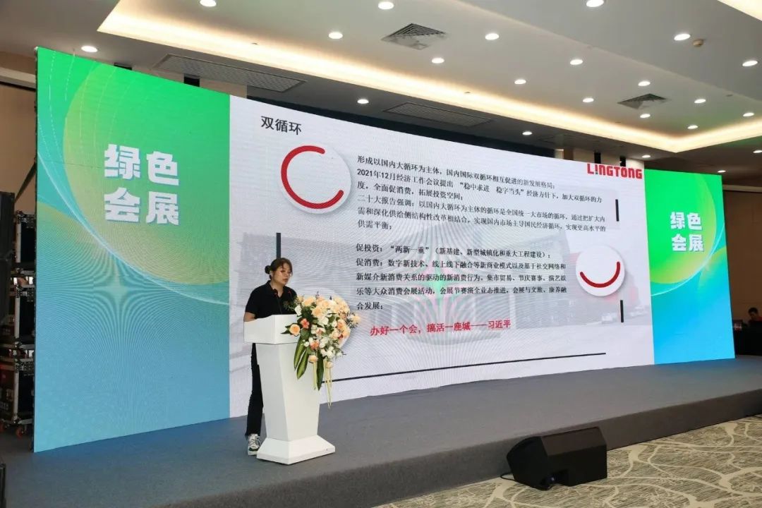 主题分享环节,灵通展览系统股份有限公司设计总监唐群女士以《灵通产品在绿色会展中的运用和实践》为主题,分享了绿色展览的发展趋势、如何扩大绿色会展影响力、灵通产品在绿色发展中的演变进程、绿色展览的各类案例等内容。唐总介绍,绿色展装的演变经历了标准展位、标异、模块化特装、满馆绿装四个阶段,每个阶段都是上一阶段的继承和提升。她认为,绿色展览的发展应该坚持定制化、标准化、模块化的理念,绿色展览的实施需要多方助力,最终实现展会现场整馆绿色低碳化。