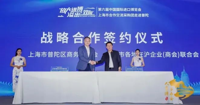 活动现场,上海市上海市普陀区商务委员会与上海市各地在沪企业(商会)联合会举行签署战略合作签约仪式协议,标志着双方将通过双向赋能,、融合创新,携手向更深层次、更宽领域发展,最终实现企业壮大与区域发展的互利双赢! 活动中,还举办了第六届中国国际进口博览会上海市合作交流采购团“放大进博溢出效应,百家商会看进博、进普陀”主题活动启动仪式。
