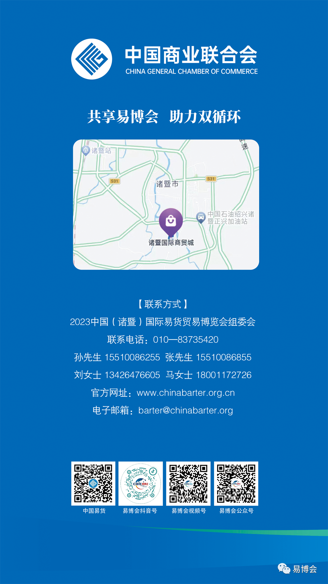 由中国商业联合会、诸暨市人民政府联合主办,中国商业联合会易货贸易分会、诸暨市商务局、诸暨商贸城建设管理委员会承办的“2023中国(诸暨)国际易货贸易博览会”(以下简称“易博会”)定于2023年11月30日—12月3日在浙江省诸暨市举办。本届“易博会”以“新易货、新机遇、新经济、新产业”为主题,展览面积3万平方米,设九个展区,1500个国际标准展位,通过数字易货贸易展览展示、项目签约、经济论坛、专题研讨、对接洽谈、市场考察等多种形式,搭建国内外易货需求企业沟通交流、业务拓展的重要平台,帮助广大企业盘活存量资源、开拓营销渠道、降低交易成本、实现减压增效,依托数字化的技术和平台,筑起行业互动、产业融合、供需对接的桥梁,打造易货贸易赋能会展经济、赋能区域经济发展的新模式,助推中国易货贸易事业高质量发展。