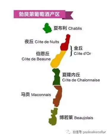 勃艮第产区位于法国东北部,是法国古老的葡萄酒产区。勃艮第有4个大的红酒产区,分别是:Beaujolais、 Cote de Beaune、Cote de Nuits、以及Cote Chalonnaise。与波尔多产区的调配葡萄酒不同,勃艮第产区的葡萄酒以单一品种葡萄酒为主。勃艮第的法定葡萄品种有黑比诺(Pinot Noir),佳美(Gamay)两种红葡萄品种,白葡萄品种则有霞多丽(Chardonnay)和亚内吉蒂(Aligote)
