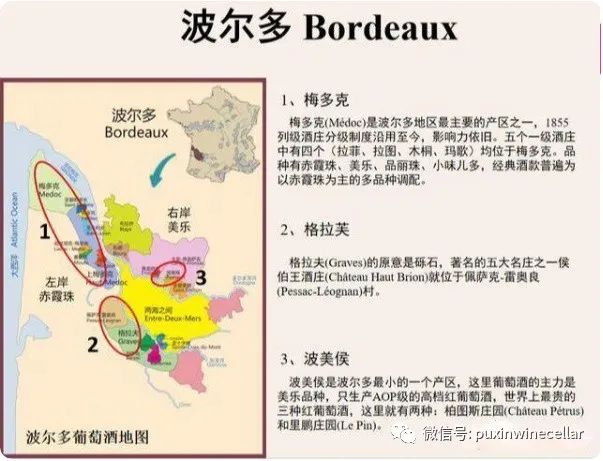 波尔多位于法国西南部,有着得天独厚的气候与地理条件。西临大西洋,吉伦特河从境内缓缓流过,海洋性温带气候让产区的天气总是那般地温和平顺。贫瘠的砂砾土、黏土和石灰土构成了复杂多样的地质结构,使波尔多能生产出丰富多样的葡萄酒。波尔多被由南向北的吉隆河一分为二,但他们并不习惯将其划分为东西岸,而是根据地理位置上的左右方向来划分,分为左岸和右岸。左岸产区主要由梅多克与格拉夫两大产区构成,右岸著名产区主要有波美侯和圣埃美隆。