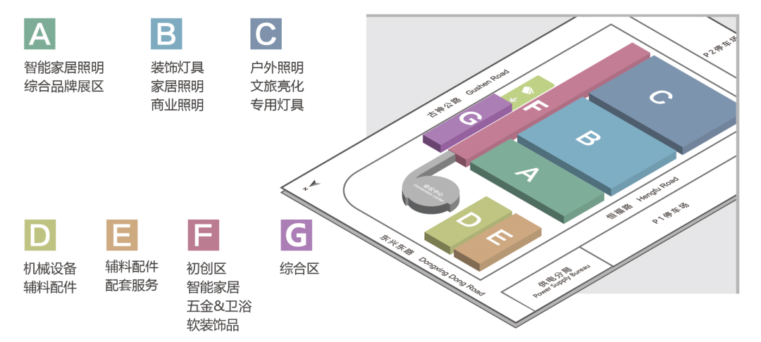 在原来A-F的6馆基础上,新增综合展馆G馆,并于各大馆内设立:初创区、中山品牌区、深圳专区、外贸专区和户外灯露营区,形成“7馆5专区”的升级格局。