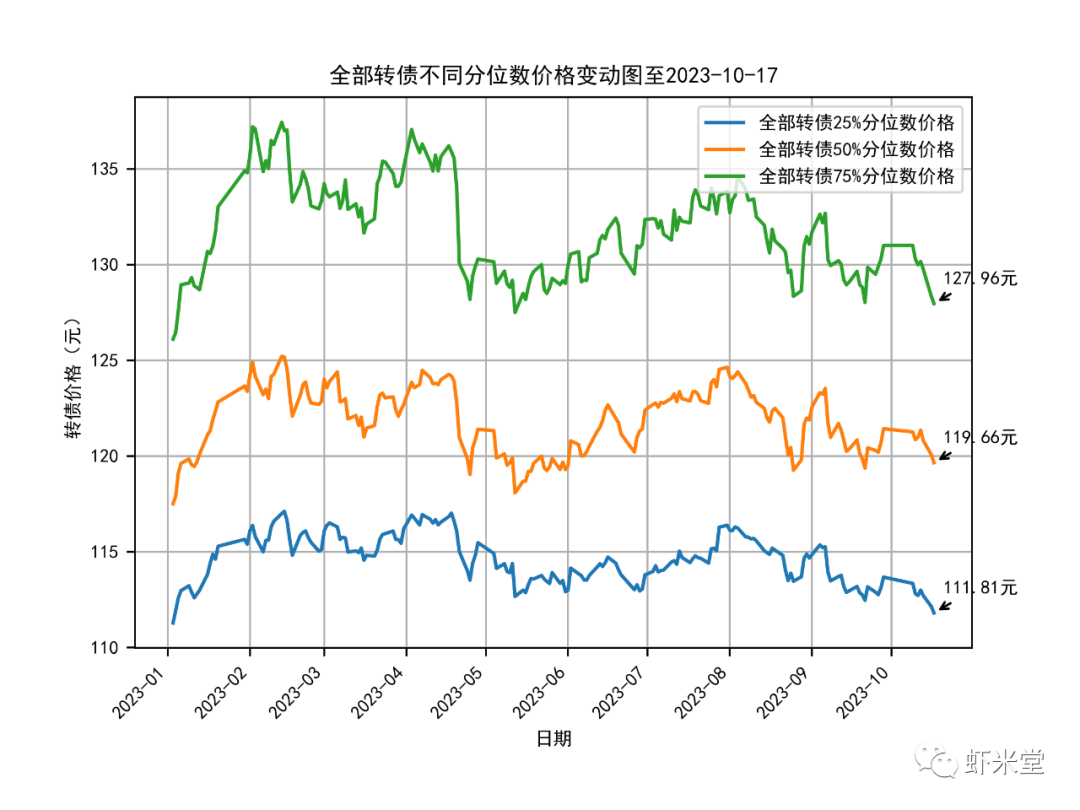 2.25%分位转债价格比昨天下跌了0.34元,真要跌到22年底的估值大概110元,还要再跌1.8元,其实也就轮动1-2个月就能回来了,不用很慌。50%分位下跌0.42元,75%分位下跌了0.39元。