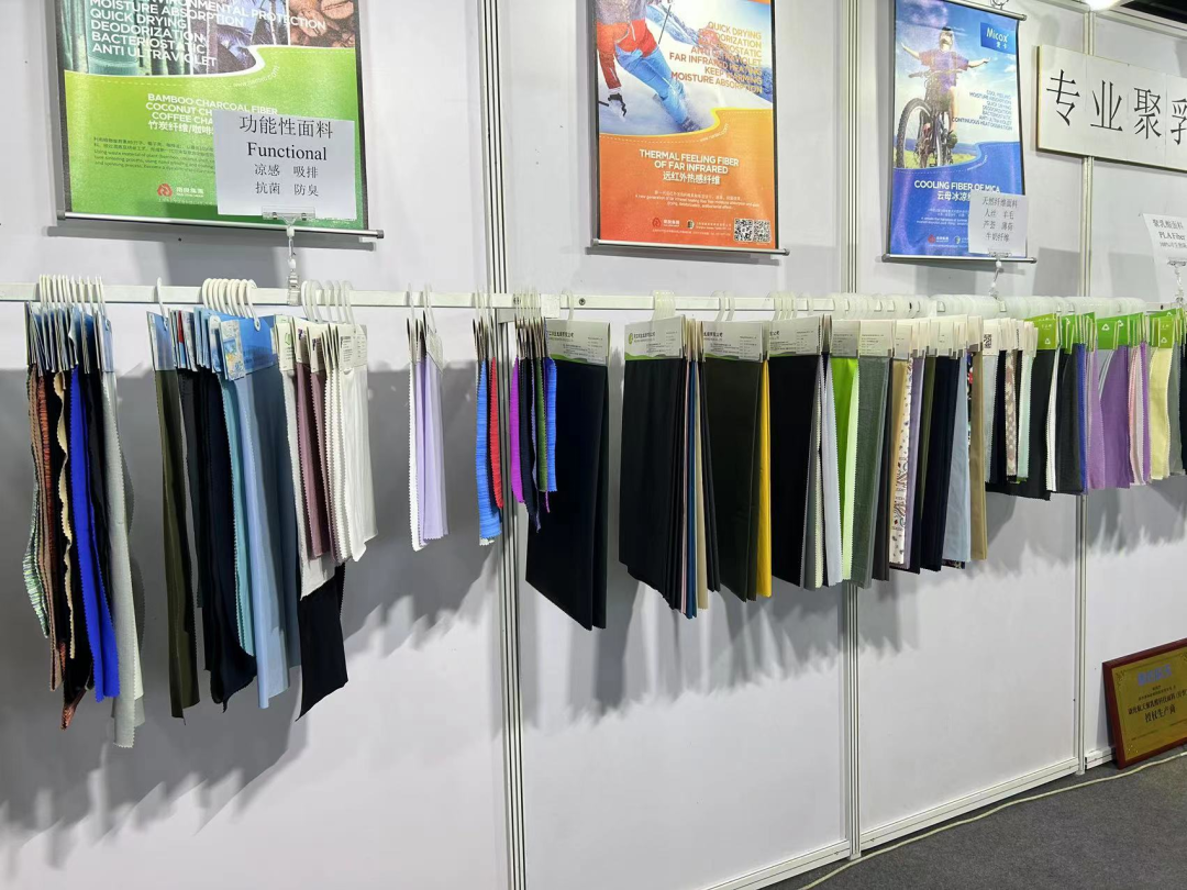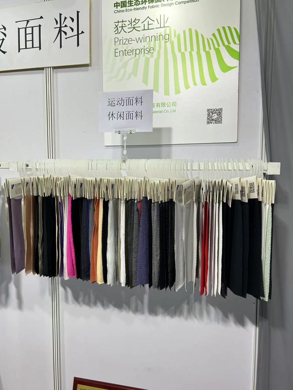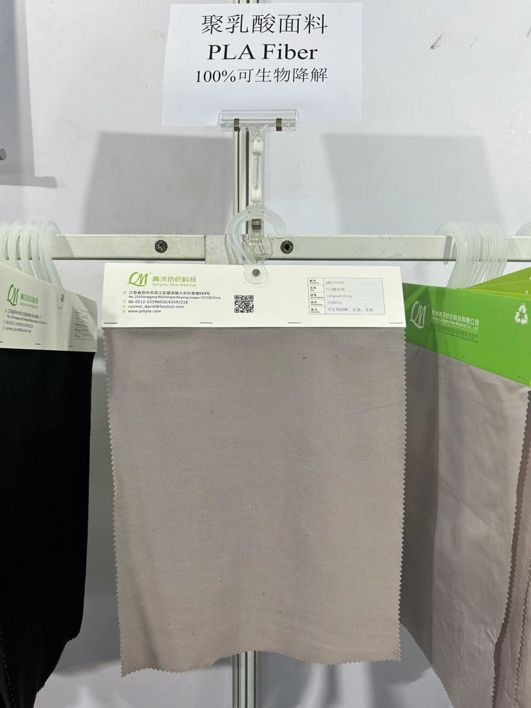负责人介绍,本次纺博会主要是推荐聚乳酸面料,种类特别多,今天客人对针织类的产品颇为感兴趣。聚乳酸摇粒绒面料,具有优异的天然抗菌功能,且PH为弱酸性,亲肤防过敏,手感也超级柔软。