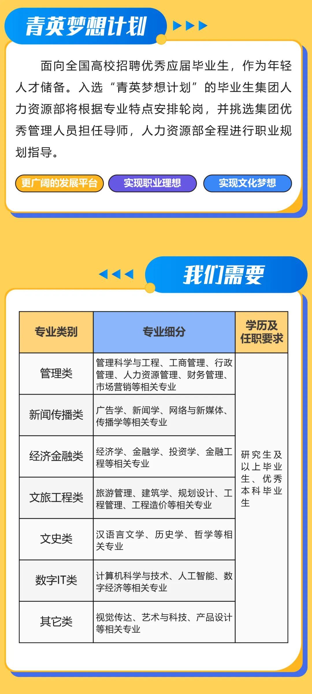 陕西文化产业投资控股(集团)有限公司(简称“陕文投集团”)成立于2009年6月,是陕西省属国有大型文化企业,是陕西实施“文化强省”战略的重要市场平台。历经十四年的发展,陕文投集团总资产达270亿元,构建起以影视生产、文化旅游、文化金融为核心主业,以艺术文创、文化传媒和文化科技等为支撑的产业布局,成为全国最具集群优势和发展活力的国有文化企业之一。陕文投集团以“让陕西文化走向全国、让中华文明走向世界”为企业使命,以“挖掘历史文化的当代价值,探索传统文化的现代表达,打造陕西文化的市场平台,推动中华文化的国际传播”为发展定位,荣获中国百强旅游投资企业、中国最佳旅游投资机构奖、最具品牌价值文化企业等70多项荣誉。陕文投集团投资制作或联合出品的影视剧达百余部,摘得“全国五个一工程奖”“飞天奖”“金鹰奖”“银熊奖”“金马奖”“金天使奖”等奖项。《王大花的革命生涯》《舰在亚丁湾》《黄土高天》《逐梦蓝天》《破晓东方》等十余部电视剧登陆央视黄金档;《叶落长安》《风起霓裳》《好先生》《恋爱先生》《啊摇篮》等四十多部热播全国一线卫视及视频网站。陕文投推动文化旅游深度融合发展,开发建设的长安十二时辰主题街区、照金红色旅游小镇、延安枣园文化广场、韩城古城历史文化景区、安康瀛湖生态旅游景区、黄帝陵文化园区中华始祖堂,成为全国文化旅游新热点。2022年建成开放的长安十二时辰主题街区,以其唐文化的独特魅力和表现形式,丰富多样的体验业态,受到社会各界的广泛关注,项目深度挖掘文化价值,用有限空间承载了游客对盛唐长安“人间烟火气”的向往,成为全国文旅行业现象级精品项目。参与建设陕西考古博物馆、国家版本馆西安分馆,建成并运营统万城国家考古遗址公园,正在推进大型高科技沉浸式文旅演艺《大秦》。陕文投大胆探索文化与金融融合发展之路,构建起文化小贷、文化担保、资产管理、产业基金、融资租赁等业态的文化金融产业链,成立了全国首个文化金控集团“文投金控”。陕文投全力推动文化科技平台建设和市场化应用,打造了智慧旅游大数据平台,上线“游陕西”App;创建全国第一家书画艺术品光谱技术实验室,构建书画艺术品大数据评估平台;依托丝路版权网,建成“西部国家版权链”,打造陕西版权贸易与保护平台。陕文投还与省级有关单位共同发起成立“陕西中华文创研究院”“陕西旅游商品研发基地”,研发千余款文创产品。西部传媒全力打造“一站式数字整合营销传播全价值链服务提供商”。西安曼蒂广场、芙蓉新天地购物中心以独特的定位和业态,成为陕文投探索文化商业发展的有力实践。文化陕西、追梦中国。根植于陕西这片文化沃土,承载着建设文化强省的历史重任,陕文投集团努力践行国有文化企业的使命担当,坚定文化自信,坚持“双效统一”,朝着全国一流文化企业的目标迈进。热忱欢迎国内外优秀人才和企业携手合作,共同开创文化产业美好未来。陕文投集团 “青英梦想计划”:面向全国高校招聘优秀应届毕业生,作为年轻人才储备。入选“青英梦想计划”的毕业生集团人力资源部将根据专业特点安排轮岗,并挑选集团优秀管理人员担任导师,人力资源部全程进行职业规划指导。“青英梦想计划”将为加入集团的优秀青年提供更广阔的发展平台,让青年人在这里实现职业理想和文化梦想。来源:陕文投集团