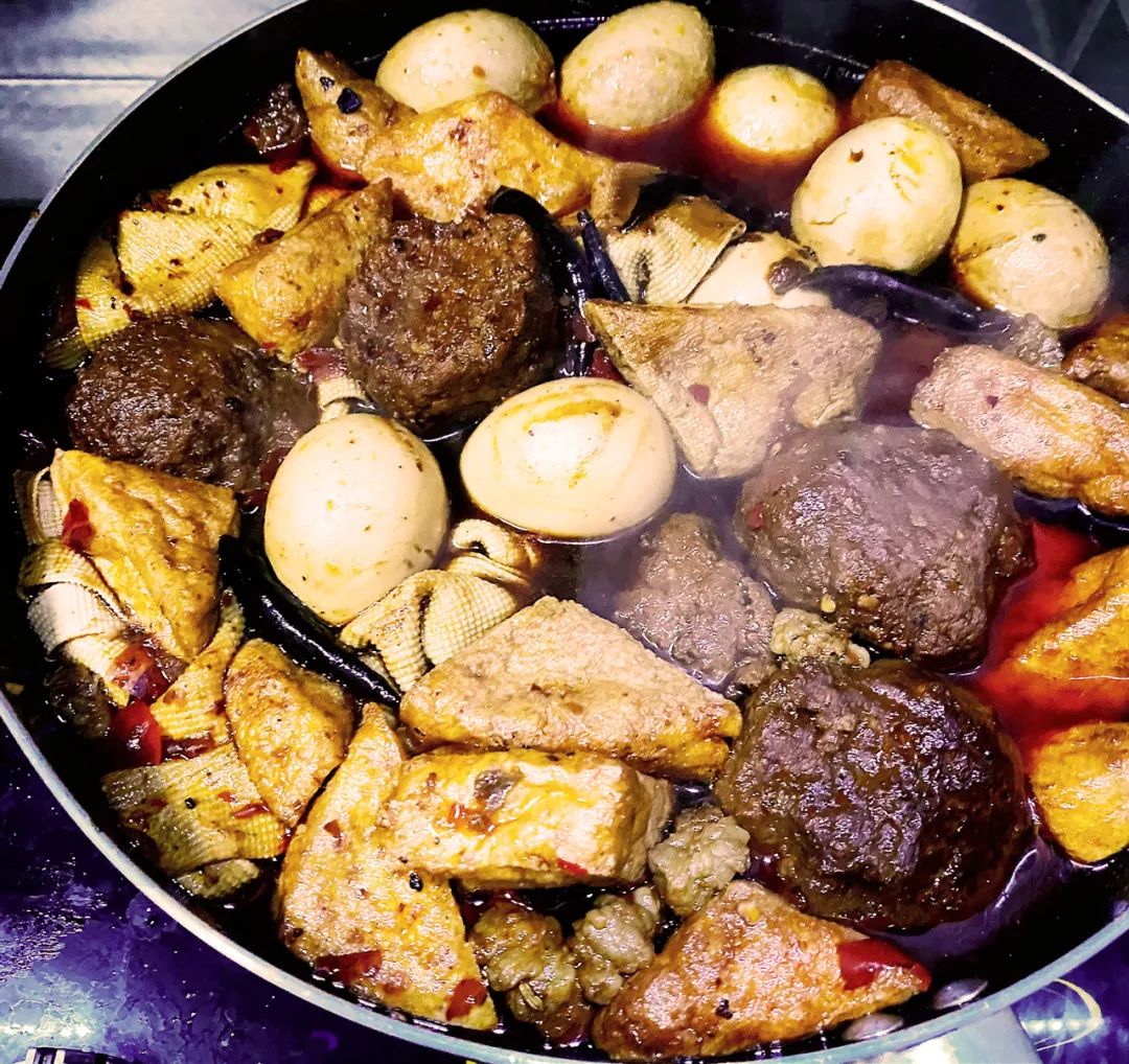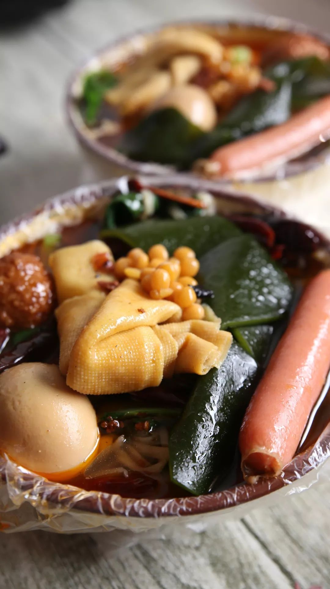 红红的辣子需要长时间的熬,把辣油和料香都煮进油里,下边一个小煤炉子不停加热,放进几个鸡蛋、丸子和豆皮,不停地小火咕嘟,越到后边越香。