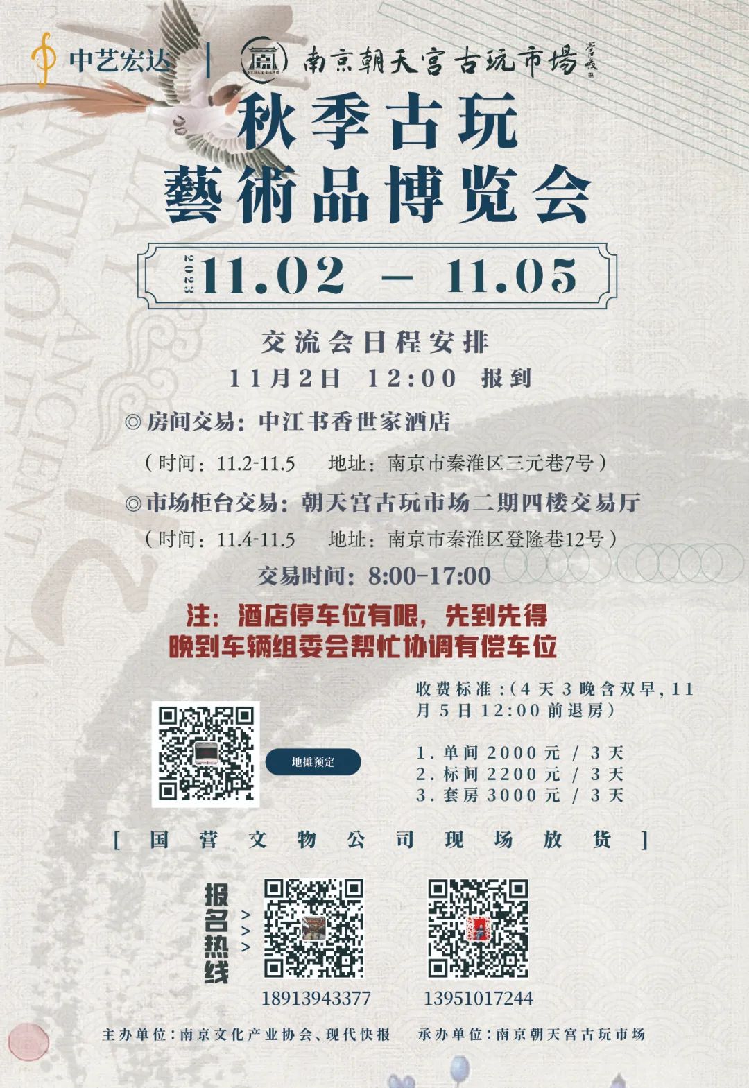 十里秦淮绕金陵,虎踞龙盘朝天宫!为了满足广大收藏爱好者对古玩艺术品的收藏需求,南京朝天宫古玩市场经研究决定:将于2023年11月2日-5日举办朝天宫秋季古玩艺术品博览会,目前招商工作已全面展开,欢迎广大参展商报名参与!