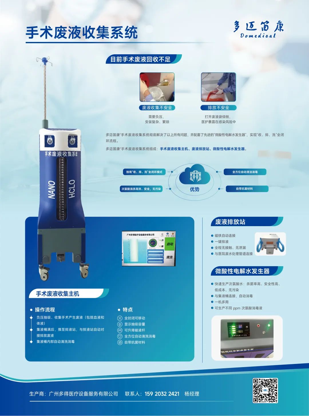 手术废液收集系统能解决手术废液收集不安全、排放不安全等废液回收不足问题,并配套了先进的微酸性电解水发生器,实现“收、排、洗”全闭环流程。
