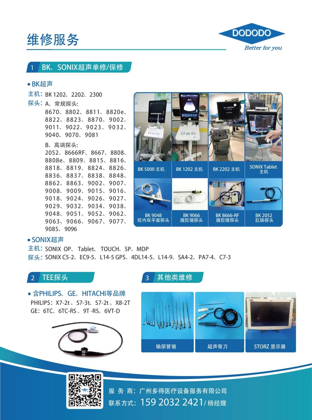 广州多得深耕维修超声、输尿管镜、超声骨刀、显示器等医疗设备十几年,常年服务于BK、SONIX、声科、PHILIPS、GE、HITACHI等各大超声品牌,并针对性地提出超声及探头的单修、保修服务,高质保量解决各种维修保修问题。