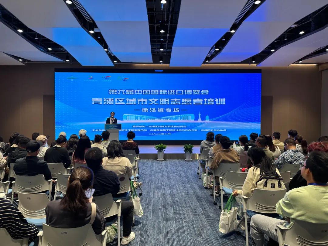 第六届中国国际进口博览会即将举办,为迎接此次进博会的到来,充分发挥进博会志愿者的主人翁意识,增强文化自信,提升服务水准,近日,由青浦区精神文明建设委员会指导,青浦区新时代文明实践中心、青浦区精神文明建设委员会办公室、青浦区志愿者协会主办的第六届中国国际进口博览会青浦区城市文明志愿者培训徐泾镇专场在青浦区银科金融中心举行。