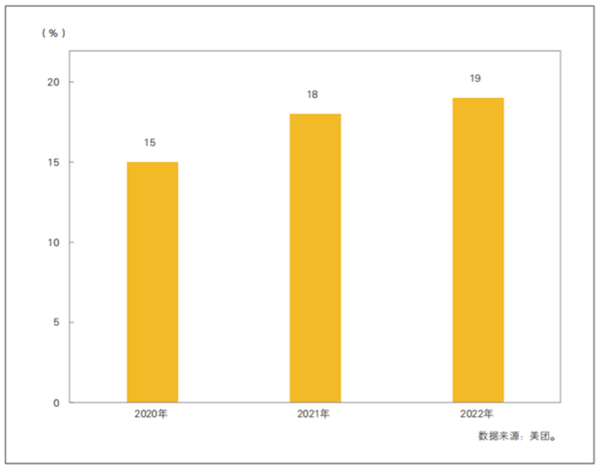 近年来,中国餐饮连锁化成为大势所趋,标志着餐饮企业迈入高质量发展新阶段。如图1-3所示,2022年中国餐饮连锁化率达到19%。