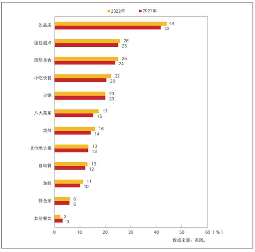 从2022年各品类的连锁化率来看,饮品店占比超过四成,面包甜点和国际美食位列第二第三,分别占比26%和25%。相比2021年各品类连锁化率,饮品店、小吃快餐、八大菜系、烧烤均提升2个百分点,面包甜点、国际美食、自助餐等品类提升了1个百分点。