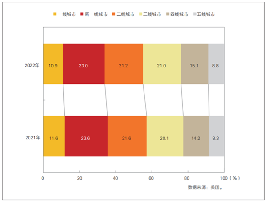在2021—2022年餐饮连锁门店地域分布中,一线、新一线、二线城市的门店数分布比例整体略有收缩的趋势,三线、四线、五线城市的连锁门店分布提升显著,2022年连锁门店在三线和四线城市的分布均提升了0.9个百分点。下沉市场连锁品牌门店的比重逐渐增加。