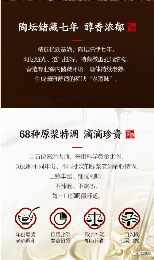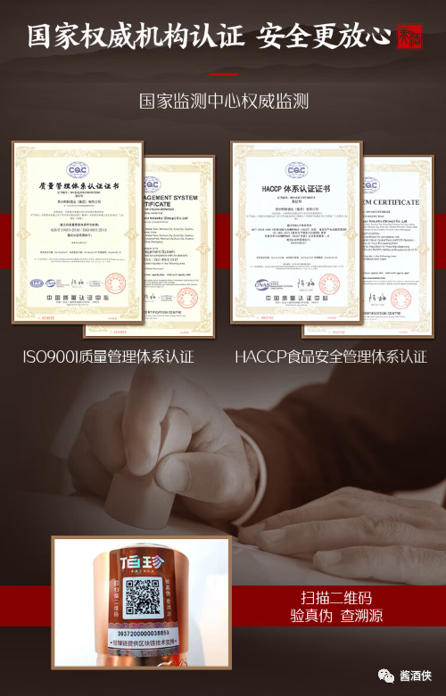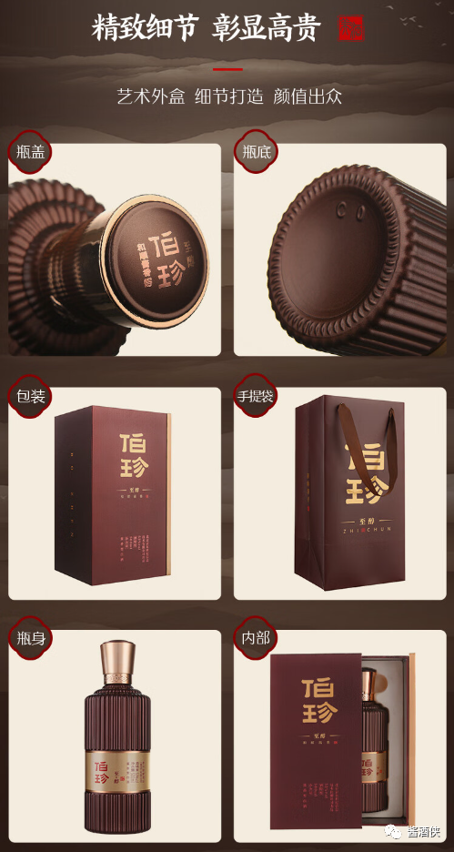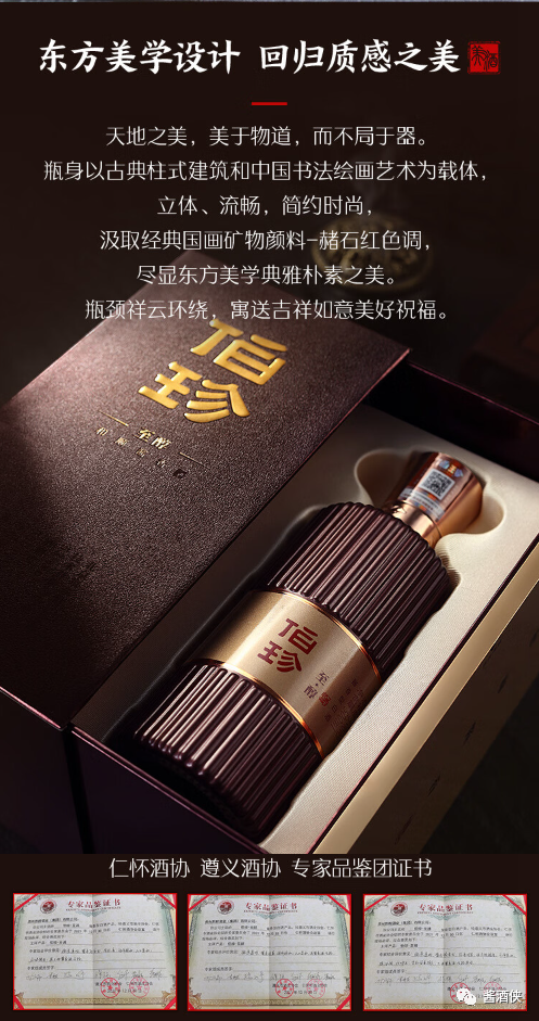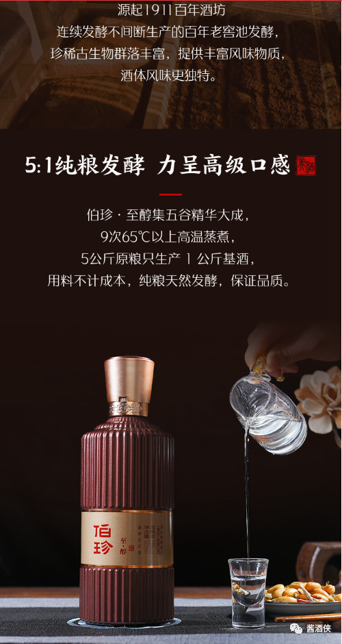 伯珍 匠心酿造 用醇萃敬纯粹 100:1.68香味酵取,营构满氛酱香 只取茅台镇红缨子高粱其中1.68%左右精华酱香因子形成纯正的酱香风味酒体 365天酿酒期,好酒靠慢酿 从投料开始至成酒出品,历经365天酿酒期 5:1精华酵酿,至醇才至香 历经9次65C以上高温蒸煮,排除杂质,只萃取20%左右精华萃取,至醇才至香 7轮酒体更新,口感步步“近”化 在365天酿酒期种,待冬春夏秋四季8次50“C以上高温堆积发酵,逐步更新酒体韵味,色、香、味更丰富。