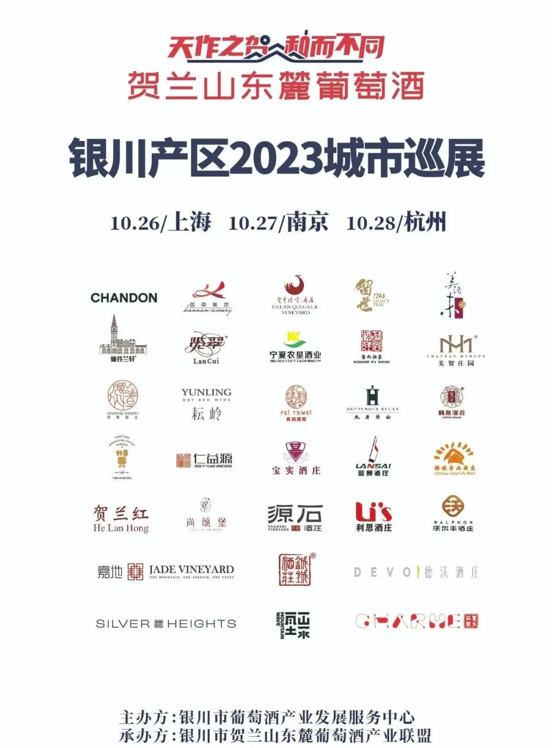 为不断提升贺兰山东麓葡萄酒市场竞争力,坚持“走出去”持续在葡萄酒产区宣传推广方面精准发力,银川市组织产区葡萄酒庄(企业)开展2023年城市巡展活动。活动将于10月26日在上海启动,10月27日-28日分别转战南京、杭州,于10月28日在杭州收官。