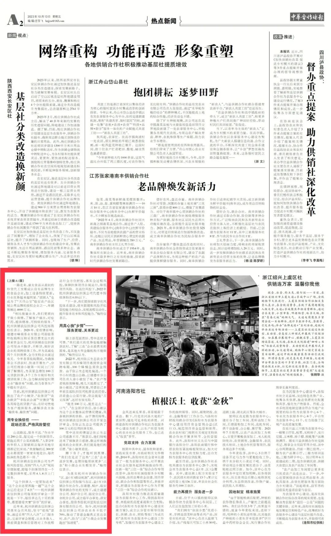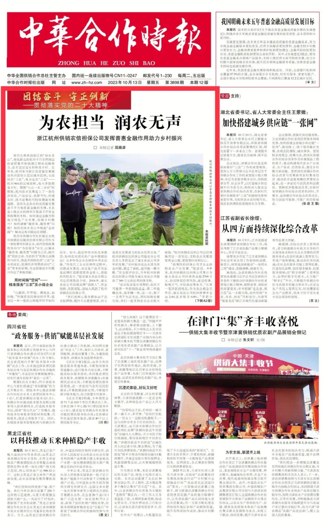 杭州市供销社社属公司杭州供销农信担保公司普惠金融为农服务被中国供销总社中华合作时报头版刊登报道。