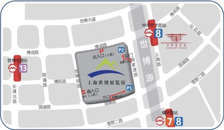 地铁13号线至世博大道站1号出口,至上海世博展览馆北广场入场