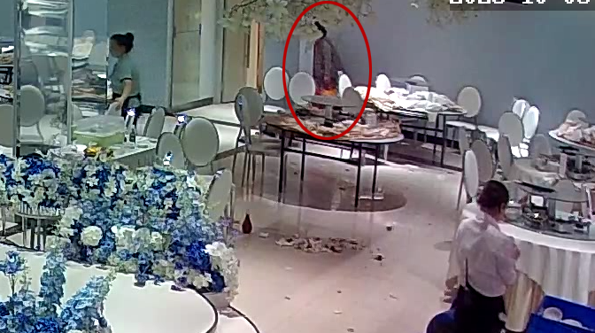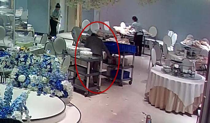 民警前往餐厅现场进行调查时,在酒店监控视频中,发现一身穿灰衣女子具有作案嫌疑,其在多个宴会厅“顺”走了伴手礼等物品。
