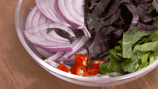 2. 薄荷、洋葱、紫苏和小米椒分别切片、切段;
