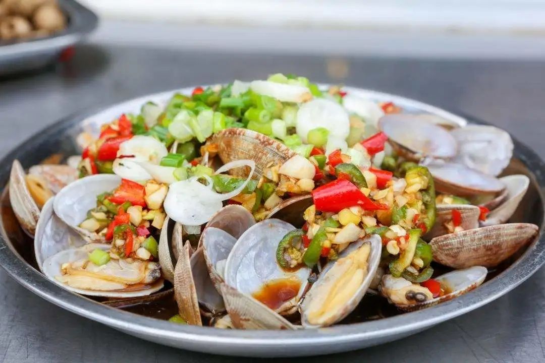 1. 花甲洗净,加姜片和食用油浸泡15分钟,放入锅内沸水焯至开口,晾凉备用;