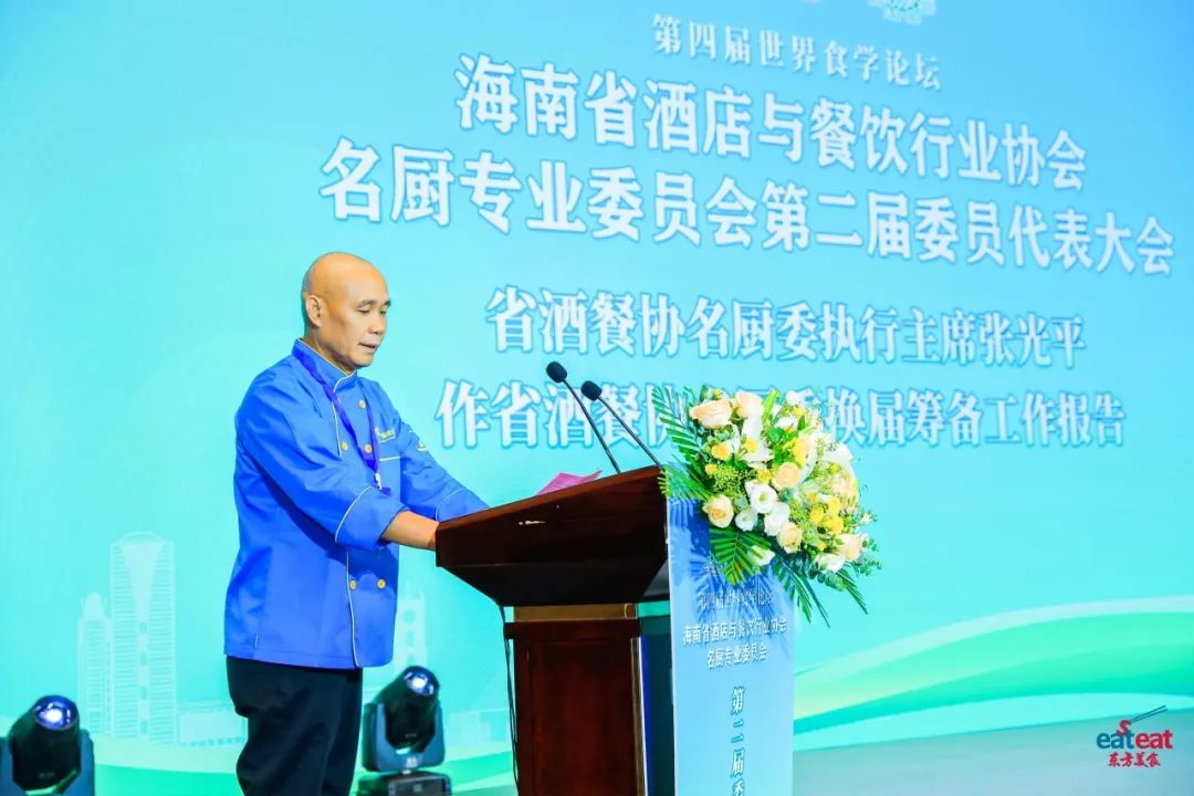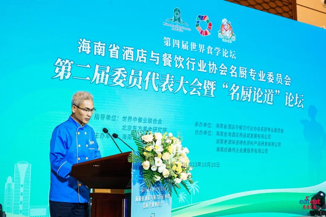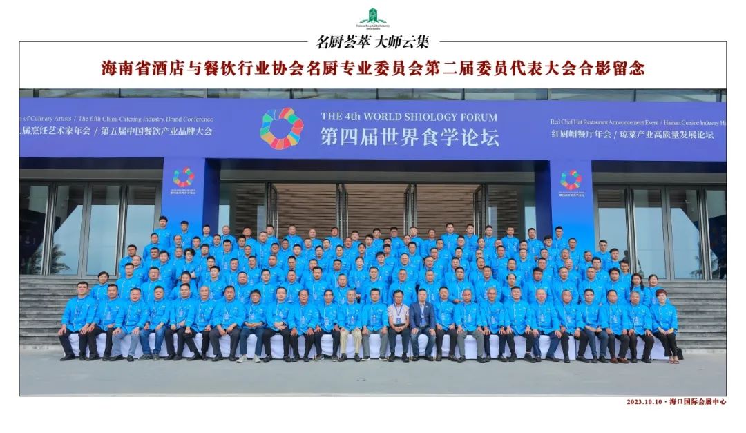 为弘扬海南传统饮食文化,推动烹饪技艺守正创新,加快名厨人才队伍建设,提升“厨德、厨艺、厨绩”,助力海南餐饮行业高质量发展,2023年10月10日,海南省酒店与餐饮行业协会于第四届世界食学论坛期间召开协会名厨专业委员会第二届委员代表大会,会议总结过去三年工作成果,选举产生新一届领导班子,并明确未来工作的发展方向和目标。特邀嘉宾:世界中餐业联合会会长邢颖,海南省酒店与餐饮行业协会会长、海南龙泉集团董事长符史钦,希腊烹饪协会主席、世界厨师无国界组织全球委员会委员Christos GKotsis,斯里兰卡厨师协会主席Dimuthu Kumarasinghe,烹饪艺术家、 成都茅歌餐饮管理有限公司董事长杨联才;省酒餐协名厨专业委员会高级顾问:中国餐饮文化大师、东方美食海南站首席执行官、《湘菜》杂志荣誉副总编、海南省酒店与餐饮行业协会高级顾问丁柳生,中国烹饪大师名人堂尊师、元老级琼菜大师唐人志,元老级中国烹饪大师、元老级琼菜大师何子桂,省酒餐协主席团主席、省酒餐协名厨委主席、海南汉群厨房好味餐饮有限公司董事长曾令漢;省酒餐协名厨专业委员会名誉主席:省酒餐协主席团主席、海南琼菜王总监陈诗汉,海南琼菜记忆总经理王树群,海南琼菜老味餐饮管理有限公司总经理云奋,琼州往事里合伙创始人柯道岳,海南沿江餐饮管理投资有限责任公司董事长符之望,三亚老阿强餐饮管理有限公司总经理林亿强,海南炳霖餐饮投资管理有限公司总经理朱炳霖,以及省内餐饮行业行政总厨、厨师长、名厨和烹饪教师等300余人出席会议。会议由省酒餐协名厨委谭蓉秘书长主持。