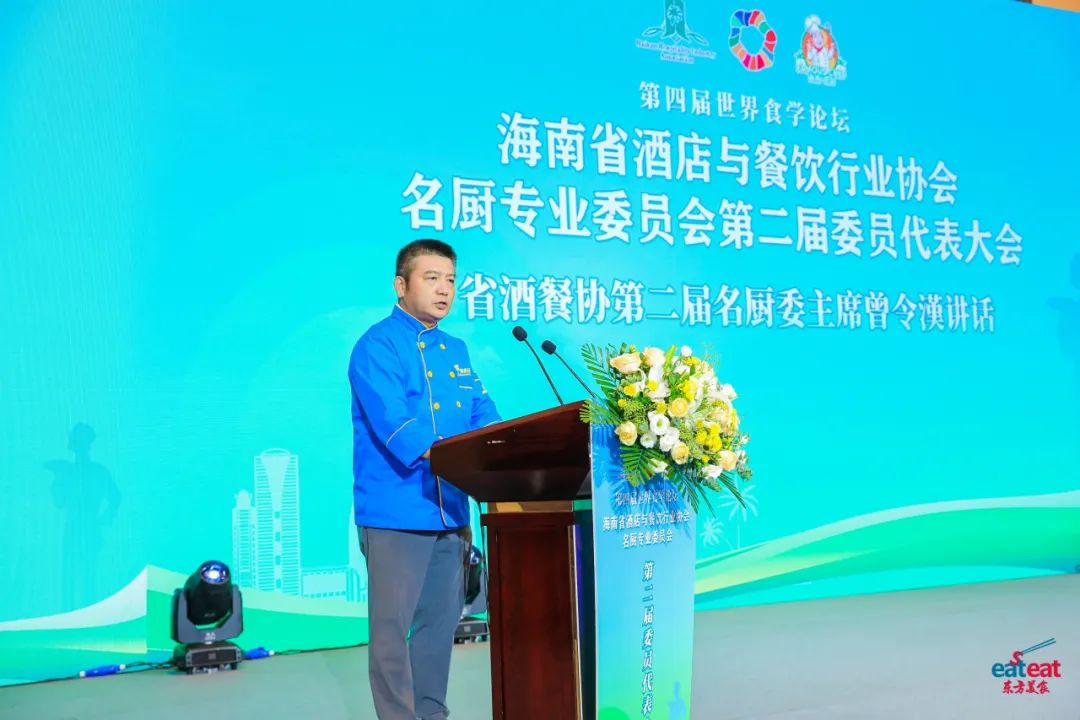 省酒餐协名厨委连任主席曾令漢作表态讲话,表示续任省酒餐协新一届名厨委主席,既是荣誉,更是使命,是挑战,更是责任,新一届名厨委将不忘传承初心,延续工匠精神;精雕细琢厨艺,在守味中创新;践行使命推琼菜,不负重托育人才,并期待携手将名厨委打造成展示厨师风采的“大舞台”、相互学习提升的“大学校”、相互支持信赖的“大家庭”、推动海南餐饮业发展的“大平台”。